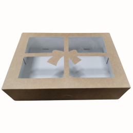 Kartonowe pudełko z okienkiem i dekoracyjną kokardą do pakowania słodkich prezentów. Eleganckie i praktyczne. Opakowanie w kolorze kraftowym pozwala na efektowną prezentację domowych wypieków. Idealnie sprawdzi się do pakowania własnoręcznie wykonanych słodkich prezentów na każdą okazję. Użyjesz go także do zapakowania pączków na tłusty czwartek!