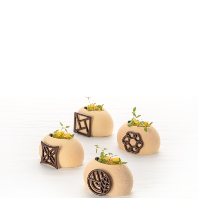 Ażurowa dekoracja wykonana z wysokiej jakości ciemnej czekolady. Idealny sposób na szybką i efektowną dekorację Twoich słodkich wyrobów. Doskonale sprawdzi się zarówno w profesjonalnej jak i domowej pracowni cukierniczej.