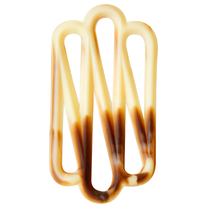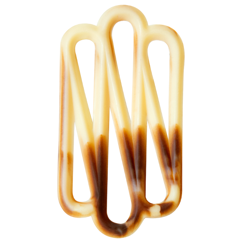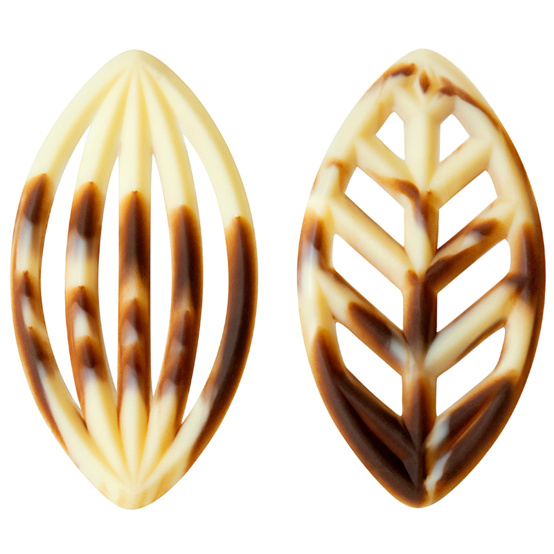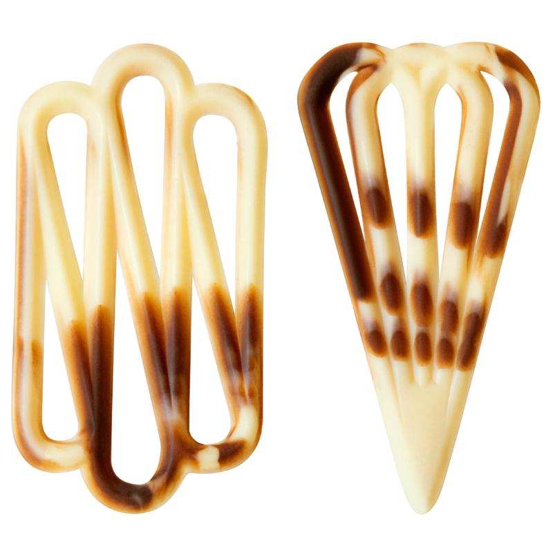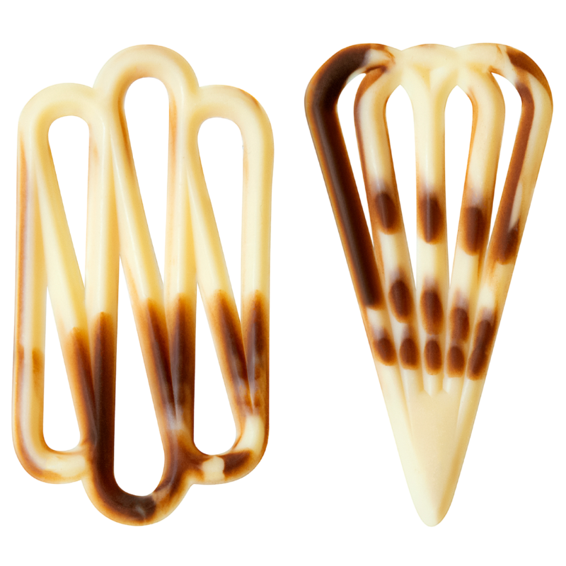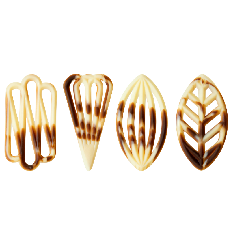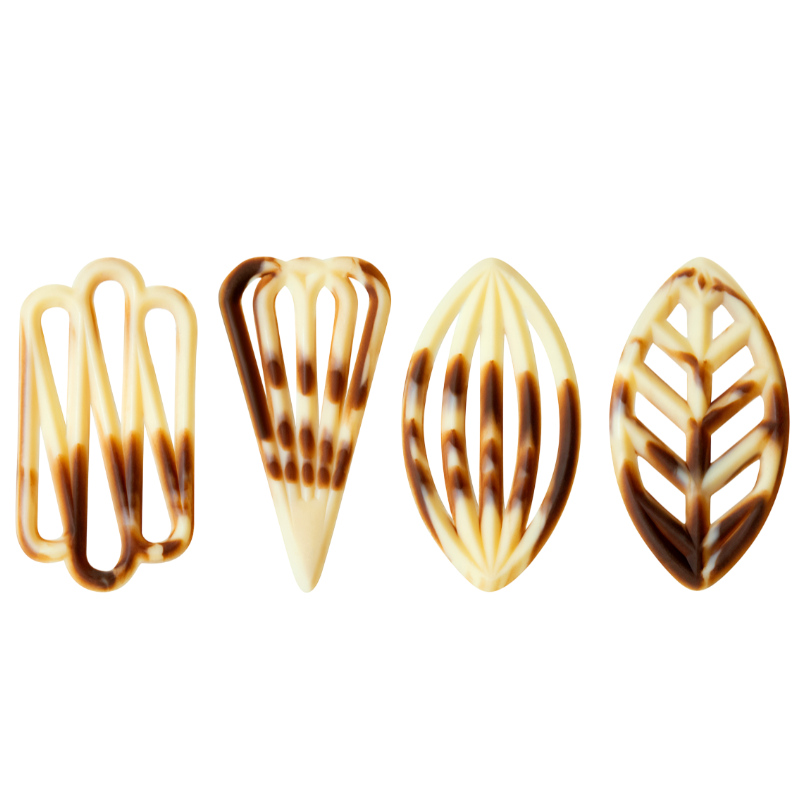 Opis: ażurki z białej i deserowej czekolady w czterech różnych kształtach do dekoracji cukierniczych.