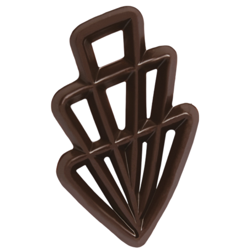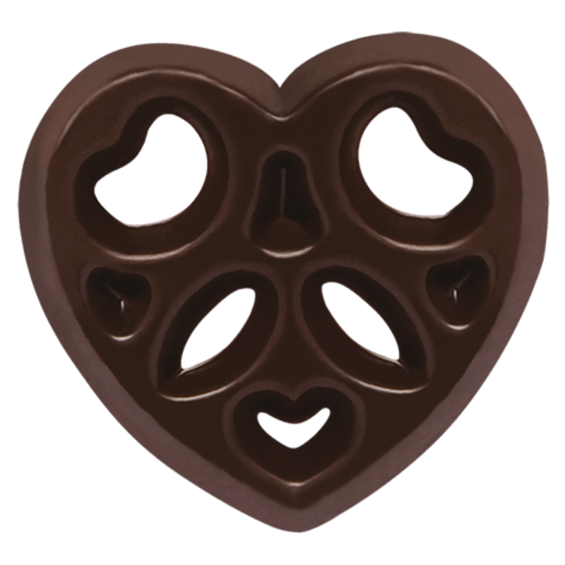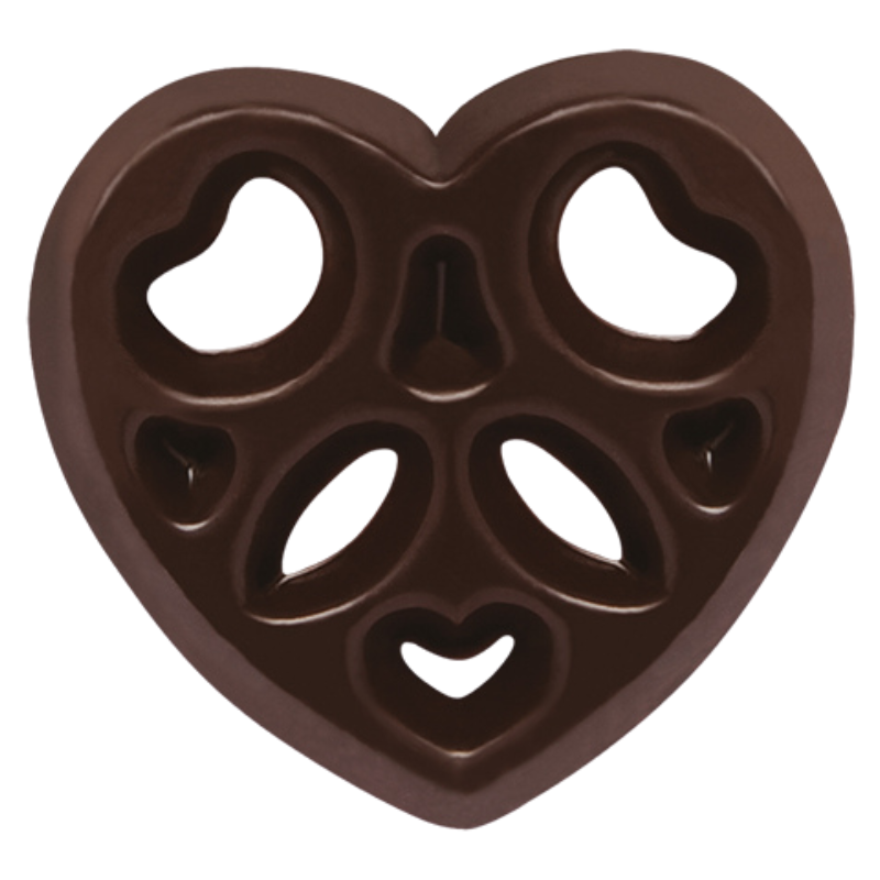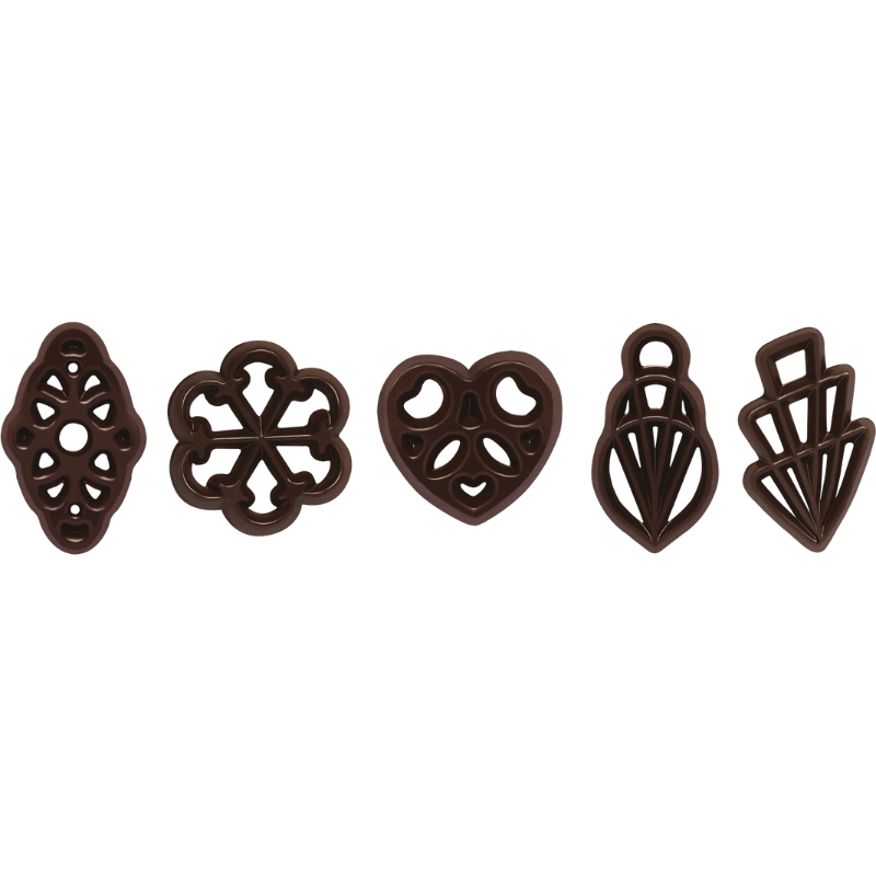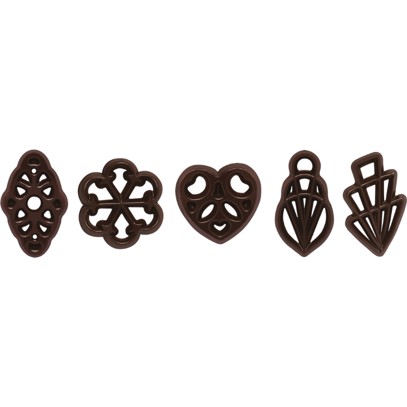 Opis: ażurki z ciemnej czekolady w pięciu różnych kształtach do dekoracji cukierniczych.