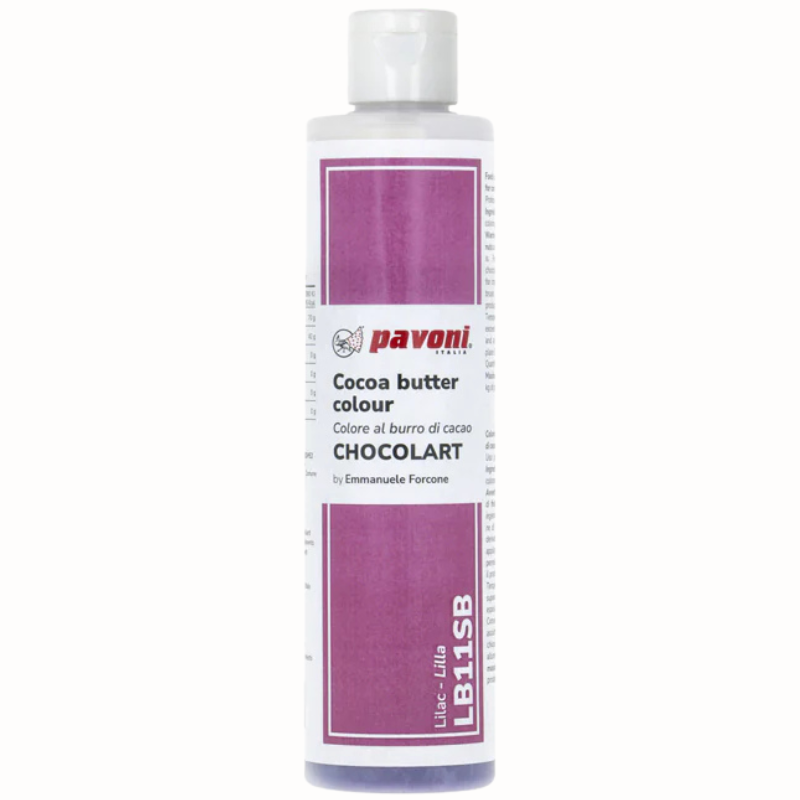 Liliowy barwnik spożywczy na bazie tłuszczu kakaowego. Przeznaczony do pracy z czekoladą. Do barwienia wyrobów czekoladowych oraz do nanoszenia na powierzchnię form do czekolady. Barwnik do użytku profesjonalnego. Nie zawiera związków azowych. Nie zawiera dwutlenku tytanu.