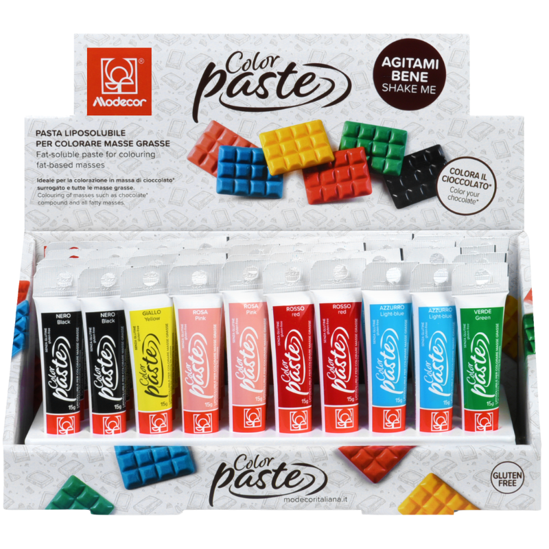 Color Paste od Modecor, to seria barwników spożywczych o konsystencji pasty. Barwniki cukiernicze na bazie tłuszczu roślinnego, w tym tłuszczu kakaowego oraz olejów roślinnych. Seria kolorowych past przeznaczonych do barwienia czekolady oraz tłustych mas i kremów cukierniczych. Paleta klasycznych kolorów, łatwych do dozowania i rozprowadzania zapakowanych w wygodne tubki z nakrętką. Barwniki doskonale sprawdzą się do barwienia pralin czekoladowych oraz dekoracji z czekolady. Barwniki na bazie tłuszczu nie zaburzają procesu temperowania czekolady. Barwniki spożywcze rozpuszczalne w tłuszczu, idealne do barwienia kremu maślanego oraz ganache, a także innych kremów i mas o tłustej konsystencji. Barwniki spożywcze przeznaczone są do dekoracji i barwienia wyrobów cukierniczych i żywności. Najlepsze odwzorowanie koloru barwnika uzyskuje się po zmieszaniu z białą czekoladą oraz jasnymi kremami.