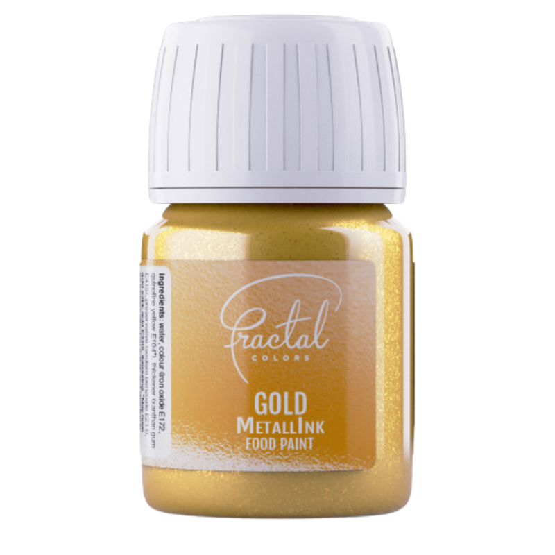 Gotowa do użycia złota farbka spożywcza z serii Metallink od Fractal Colors - odcień błyszczącego złota! Jadalna farbka do nanoszenia na powierzchnię wyrobów cukierniczych za pomocą pędzelka lub gąbki. Farbka do tworzenia metalicznych napisów na torcie. Złoto de dekoracji figurek z masy cukrowej i marcepanu! Wypróbuj sam!