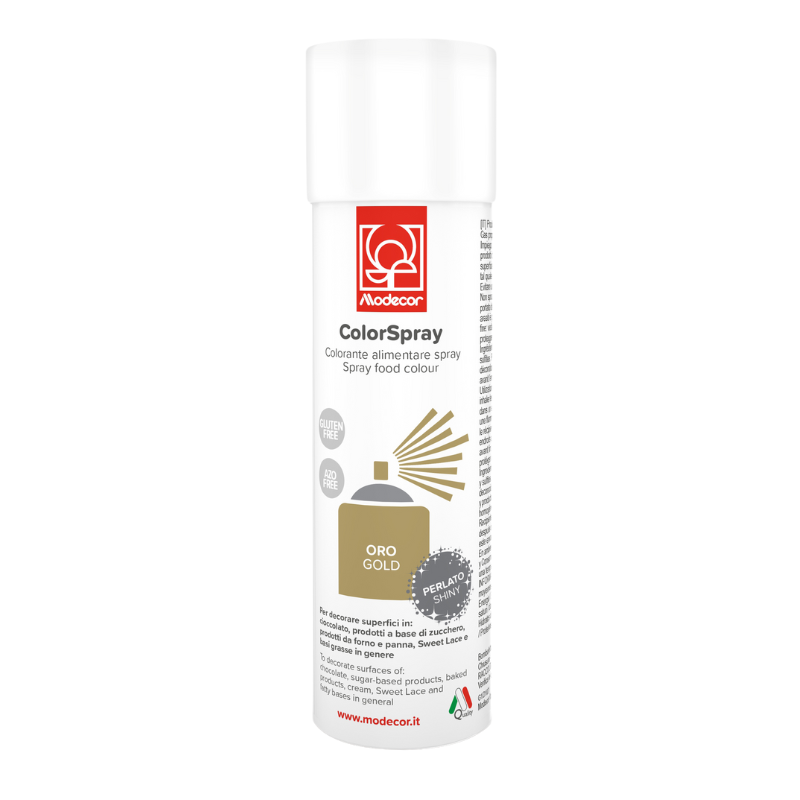 COLOR SPRAY PERLATO - to seria błyszczących barwników w postaci sprayu (na bazie alkoholu etylowego). Przeznaczone są do dekorowania powierzchni wyrobów cukierniczych przygotowanych z czekolady (tabliczki czekolady, praliny, figurki, polewy itp.) oraz produktów na bazie cukru (masy cukrowej, lukru itp.) lub marcepanu. Barwniki nadają wyrobom barwę oraz zapewniają błyszczące wykończenie. Barwniki w postaci sprayu należy dokładnie wstrząsnąć przed każdym użyciem.