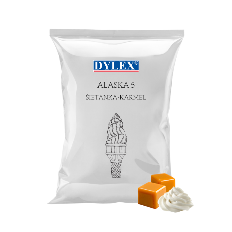 ALASKA 5 - to koncentraty w proszku do przygotowywania lodów amerykańskich w automatach, charakteryzujące się doskonałym smakiem i aromatem. Dzięki odpowiednio dobranym aromatom lody mają specyficzny i niepowtarzalny smak. Gładka struktura masy lodowej i wysoki stopień zmrożenia pozwalają na odpowiednie nakręcanie lodów na wafle - zapewnia to efekt wysokich świderków. W koncentratach stosowane są wyłącznie naturalne barwniki (pochodzenia roślinnego). Receptura koncentratów oparta jest na pełnotłustym mleku w proszku, które nadaje lodom bogaty i naturalny smak oraz aksamitną strukturę. Koncentraty przeznaczone są do produkcji (tak zwanych) lodów amerykańskich - świderków, które w odróżnieniu od lodów włoskich mają zwartą (gęstą) i twardą konsystencję (bez napowietrzenia). Masa lodowa może być poddawana pasteryzacji bez wpływu na barwę oraz smak lodów. Daje również możliwość mrożenia w bardzo niskich temperaturach - nawet do (-) 10°C. Przygotowane z koncentratu lody są stabilne termicznie - dobrze znoszą wahania temperatur.