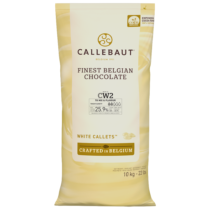 Klasyczna biała czekolada - wytwarzana z mieszanki wyselekcjonowanych ziaren kakaowych z trzech różnych krajów - Wybrzeże Kości Słoniowej, Ghana, Ekwador - dla uzyskania idealnie harmonijnego, bogatego smaku. Czekolada zawdzięcza swój unikalny profil smakowy wysokiej zawartości kakao pozyskiwanego z najlepszych ziaren. Charakteryzuje się zrównoważonym smakiem z dominującymi nutami mleka i wanilii. Kremowa i gęsta konsystencja oraz niska płynność czekolady sprawia, że doskonale sprawdza się do ganache, musów, kremów oraz modelowania większych figurek czekoladowych. Dodatkowo jej delikatny i bardzo przyjemny smak doskonale łączy się z różnorodnymi składnikami i aromatami. Receptura numer CW2 - to biała belgijska czekolada o minimalnej zawartości kakao 25.9% (czyste masło kakaowe).