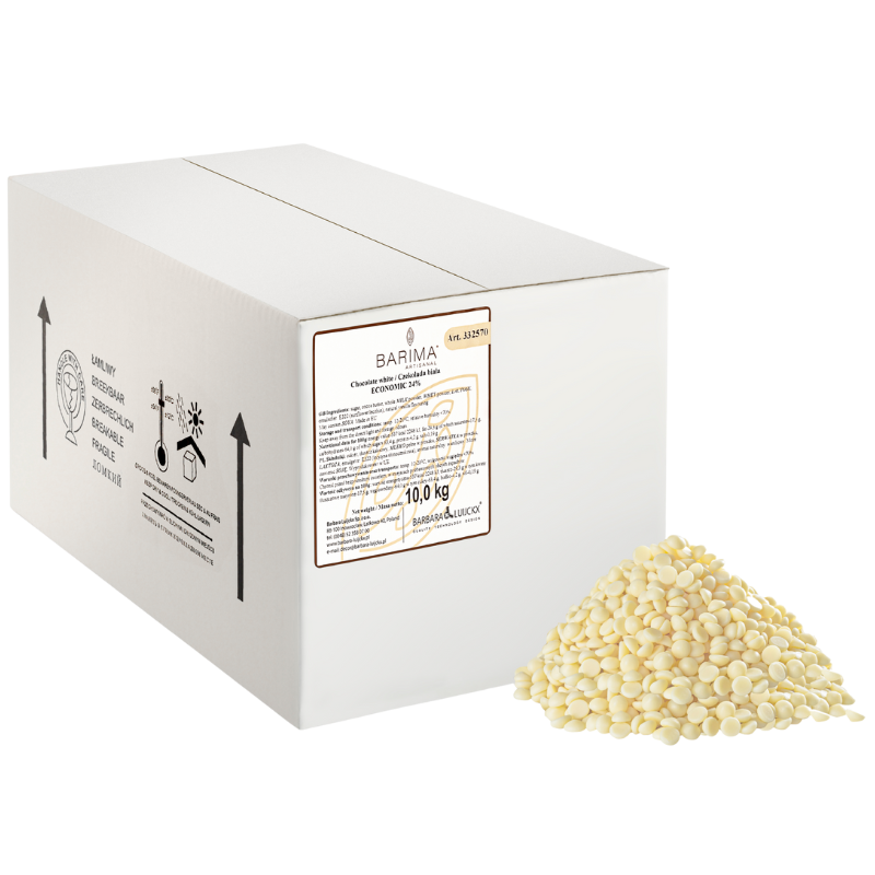 10 kg BIAŁA CZEKOLADA 24% ECONOMIC 332570 BARIMA w postaci pastylek formowanych z zatemperowanej czekolady