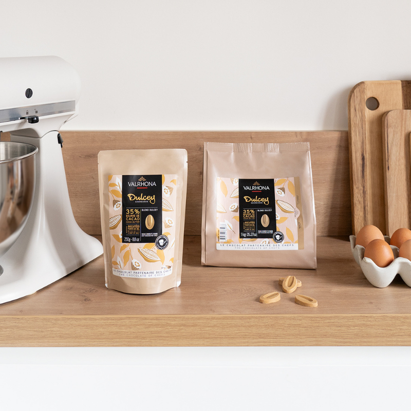 Blond Dulcey, to biała czekolada o wyjątkowo kremowej konsystencji i przyjemnej złotej barwie. Wytwarzana na bazie tłuszczu kakaowego, mleka i cukru. Niewielki dodatek masła zapewnia czekoladzie charakterystyczny aromat ciasteczek biszkoptowych. Subtelne maślane i karmelowe nuty. Czekoladę Blond Dulcey można stosować w klasycznych przepisach, idealnie sprawdza się do kremów, musów i ganache. Doskonale nadaje się do powlekania i formowania deserów, w tym pralin, trufli i batonów. Niepowtarzalny wygląd i smak czekolady pozwala na tworzenie zaskakujących przepisów. Biała czekolada o aksamitnej i otulającej konsystencji w ciepłym kolorze Blond.