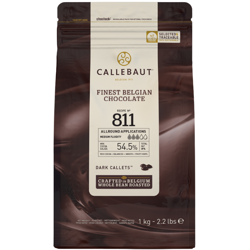 Uniwersalna ciemna czekolada wytwarzana z mieszanki wyselekcjonowanych ziaren kakaowych z trzech różnych krajów - Wybrzeże Kości Słoniowej, Ghana, Ekwador - dla uzyskania idealnie harmonijnego, bogatego smaku. Charakteryzuje się zrównoważonym, gładkim smakiem, bogatym w kakao z wyczuwanymi nutami owocowymi. Uniwersalna płynność czekolady sprawia, że doskonale sprawdza się w różnorodnych zastosowaniach (jest jedną z najczęściej wybieranych czekolad przez szefów kuchni i mistrzów cukiernictwa). Receptura numer 811 - to ciemna belgijska czekolada o minimalnej zawartości kakao 54.5% i statusie kuwertury (zawartość masła kakaowego - 36.6%).