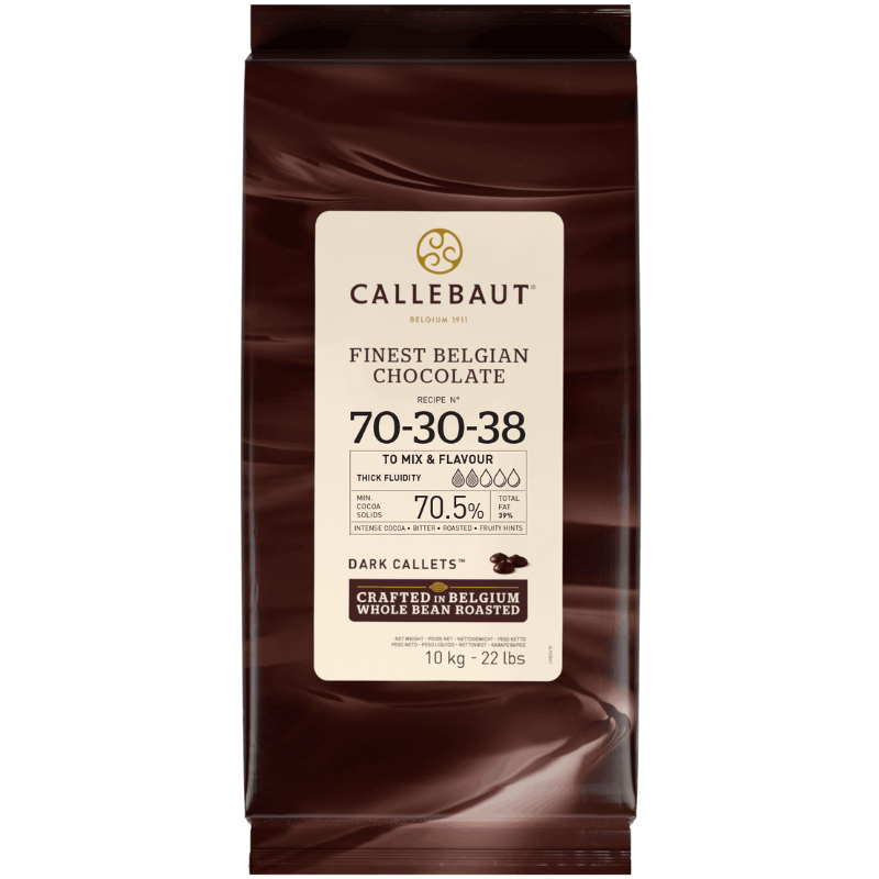 Uniwersalna ciemna czekolada wytwarzana z mieszanki wyselekcjonowanych ziaren kakaowych z trzech różnych krajów - Wybrzeże Kości Słoniowej, Ghana, Ekwador - dla uzyskania idealnie harmonijnego, bogatego smaku. Czekolada zawdzięcza swój unikalny profil smakowy wysokiej zawartości kakao pozyskiwanego z najlepszych ziaren. Charakteryzuje się intensywnym smakiem z dominującym smakiem prażonych ziaren kakao, nutą goryczy i świeżymi, owocowymi akcentami. Niska płynność czekolady sprawia, że doskonale sprawdzi się w różnorodnych zastosowaniach. Receptura numer 70-30-38 - to ciemna belgijska czekolada o minimalnej zawartości kakao 70.5% i statusie kuwertury (zawartość masła kakaowego - 38.9%).