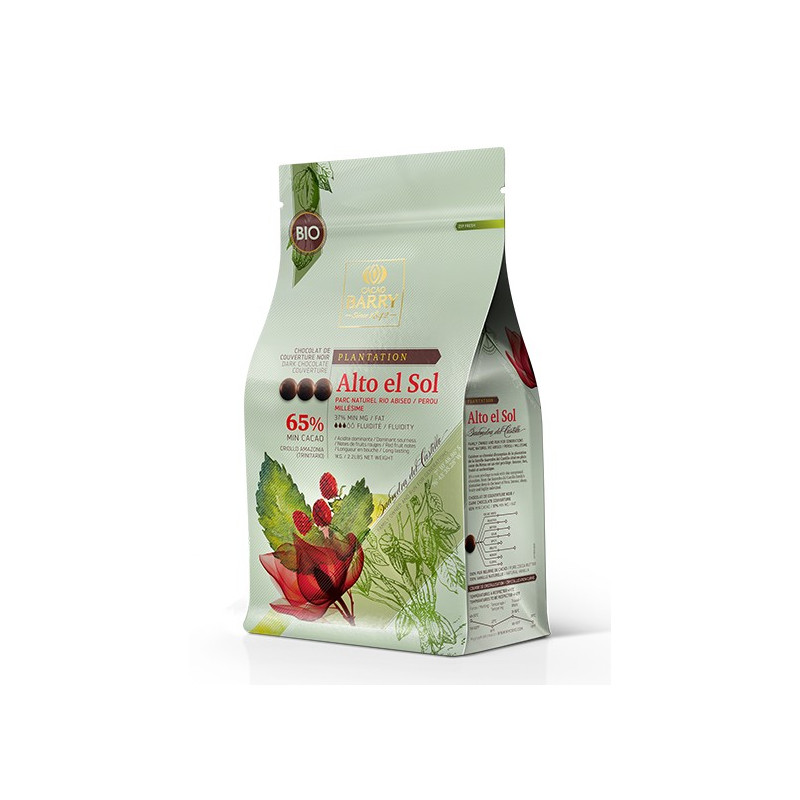 Dominująca kwaśność i czerwone owoce nadają tej ciemnej czekoladzie bardzo długotrwały smak. W sercu peruwiańskiego parku przyrody plantacja Alto El Sol jest chroniona przez bujne środowisko, dzięki czemu drzewa kakaowe mają całe swoje bogactwo. Ziarno kakaowca pochodzi z plantacji peruwiańskiej, a odmiana to Criollo Amazonia (Trinitario). Czekolada kuwertura ekologiczna (masa kakaowa minimum 65%). Wyczuwalne nuty smakowe: Wanilia, Speculoos, Fasolka tonka, Eukaliptus, Morela, Brzoskwinia, Mango, Śliwka Mirabelka, Czerwona papryka, Pomidor, Bergamota, Banan, Migdały, Pistacja, Oliwa z oliwek.