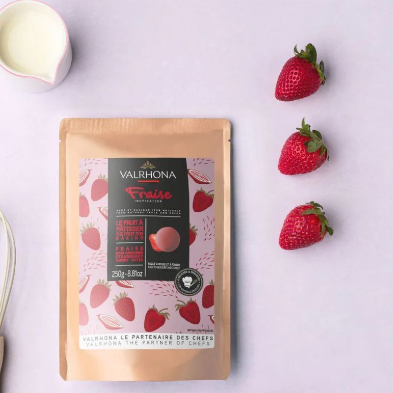 Inspiration Fraise, to subtelne połączenie tłuszczu kakaowego, cukru i truskawek. Owocowa specjalność, która daje nowy wymiar przepisom o smaku owocowym. Doskonale zbilansowana słodycz z cukierkową nutą kandyzowanych owoców. Czekolada charakteryzuje się bardzo atrakcyjną różową barwą. Przeznaczona jest do tworzenia pralin i batonów czekoladowych. Pozwala uzyskać aromatyczne musy czekoladowe, ganache oraz kremy przygotowywane na bazie śmietany. Czekolada wytwarzana jest w postaci niewielkich dropsów. Dropsy są łatwe do dozowania (pozwalają na precyzyjne odważanie) i upłynniania, co znaczenie usprawnia pracę z czekoladą - stanowią wygodną alternatywę dla tabliczek czekolady. Główne zastosowania: odlewanie i formowanie, praliny i batony czekoladowe, musy, ganache, kremy na bazie śmietany.