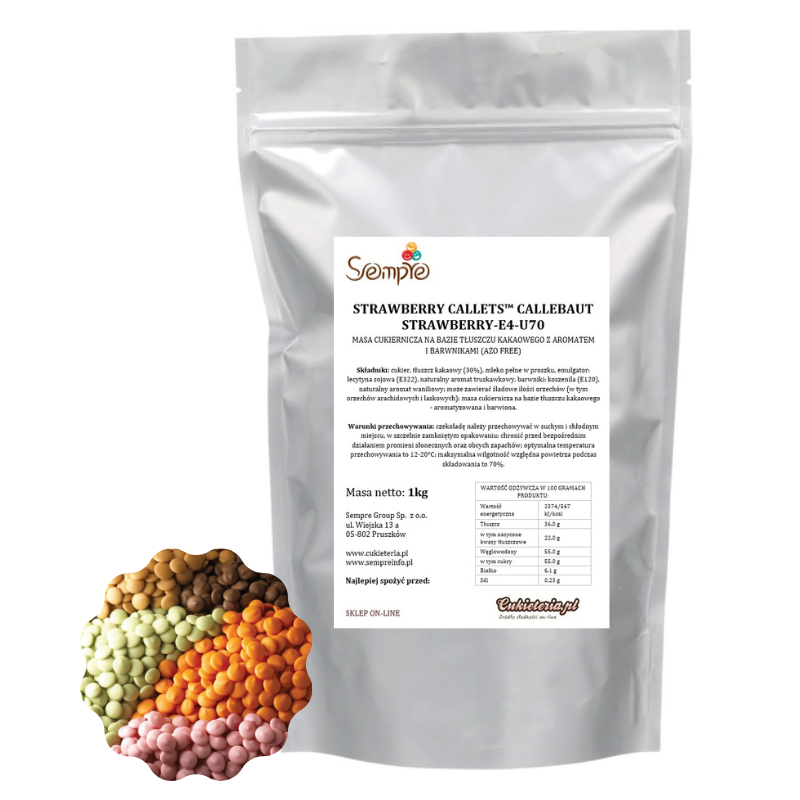 STRAWBERRY CALLETS™ - to kaletki wykonane na bazie białej belgijskiej czekolady z aromatem truskawkowym o wyjątkowej różowej barwie. Czekolada posiada wyjątkowy profil smakowy, który łączy w sobie śmietankowo-karmelową słodycz białej czekolady z lekko kwaśnym smakiem truskawki. Przeznaczona jest przede wszystkim do nadawania pięknej i nietuzinkowej barwy różnorodnym słodkim kreacjom. Czekolada truskawkowa zachowuje się jak klasyczna biała czekolada - podczas topienia, temperowania czy schładzania. Uniwersalna płynność (3/5) sprawia, że czekolada doskonale sprawdzi się w różnorodnych zastosowaniach - do formowania, oblewania, aromatyzowania i barwienia (musów i kremów) oraz tworzenia dekoracji. Masa cukiernicza na bazie tłuszczu kakaowego z aromatem i barwnikami (AZO FREE).
