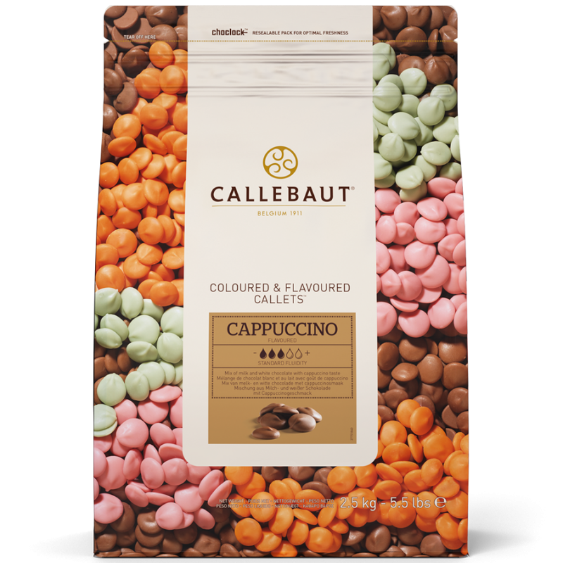 CAPPUCCINO CALLETS™ - to mieszanka mlecznej i białej belgijskiej czekolady z kawą o ciepłej brązowej barwie. Czekolada zawdzięcza swój unikalny profil smakowy (kawy cappuccino) połączeniu bogatego smaku belgijskiej czekolady z ziarnami kawy. Czekolada charakteryzuje się zrównoważonym słodkim smakiem z wyczuwalnymi nutami śmietanki, kakao oraz kawy. Czekolada cappuccino zachowuje się jak klasyczna mleczna czekolada - podczas topienia, temperowania czy schładzania. Uniwersalna płynność (3/5) sprawia, że czekolada doskonale sprawdzi się w różnorodnych zastosowaniach - do formowania, oblewania, aromatyzowania (musów i kremów) oraz tworzenia dekoracji. Mieszanka białej i mlecznej czekolady z kawą o minimalnej zawartości masy kakaowej - 30.8%.