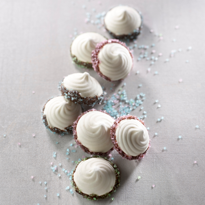 Klasyczne bezy oprószone barwnikami spożywczymi - idealny sposób na szybką i efektowną dekorację wyrobów cukierniczych. Doskonałe do ozdabiania tortów i wypieków z kremami.