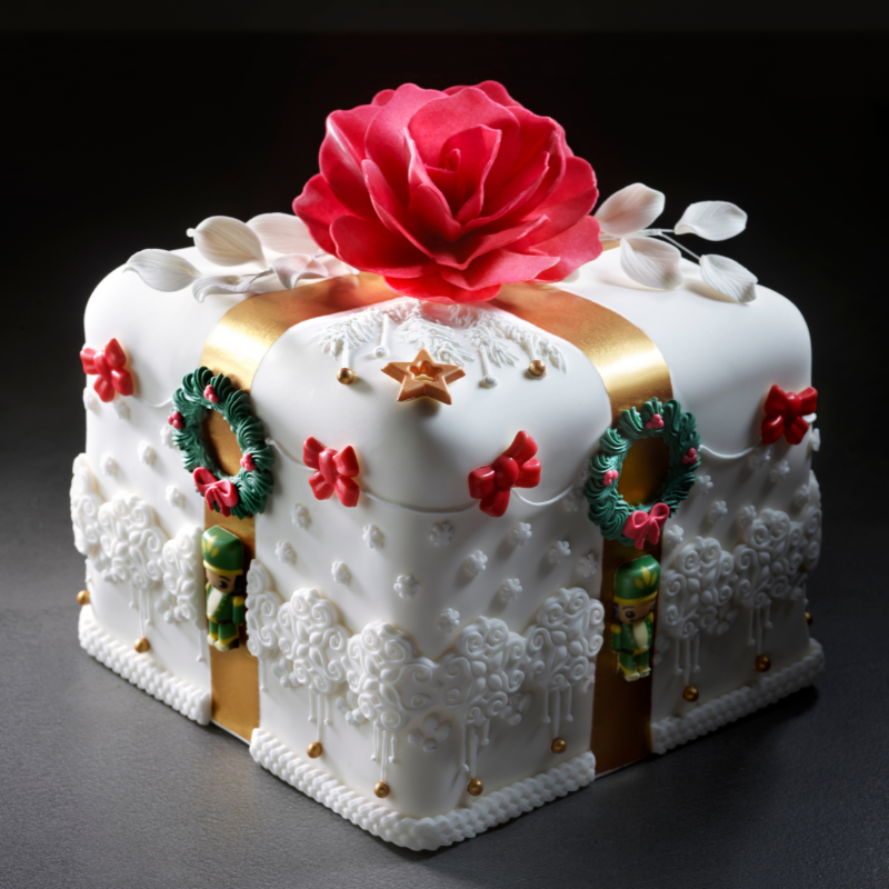 Zestaw dekoracji cukrowych na święta Bożego Narodzenia w czterech wzorach: czerwona kokarda, choinka, głowa renifera i piernikowy ludzik. Wypukłe dekoracje do ozdabiania świątecznych wypieków i deserów.