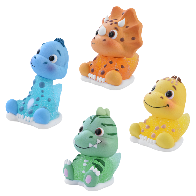 Zestaw gotowych figurek cukrowych w czterech wzorach. Kolorowe dinozaury do dekoracji tortów urodzinowych dla najmłodszych smakoszy.