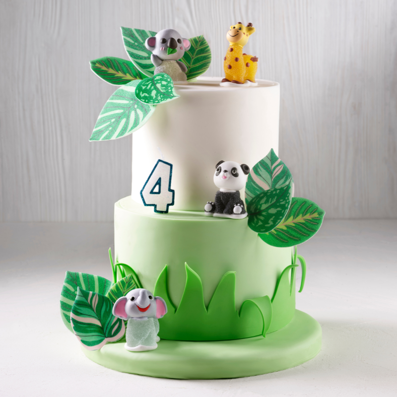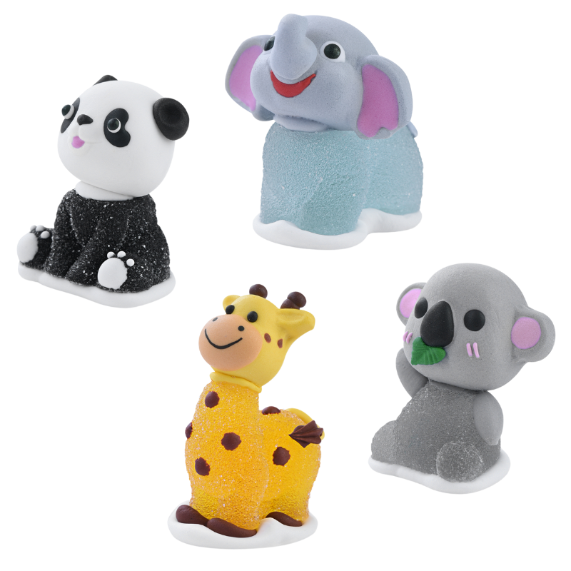 Zestaw gotowych figurek cukrowych w czterech wzorach. Urocze zwierzątka do dekoracji tortów urodzinowych dla najmłodszych smakoszy.