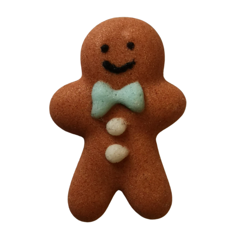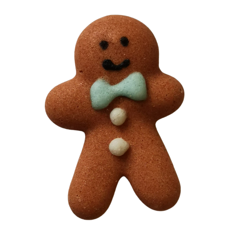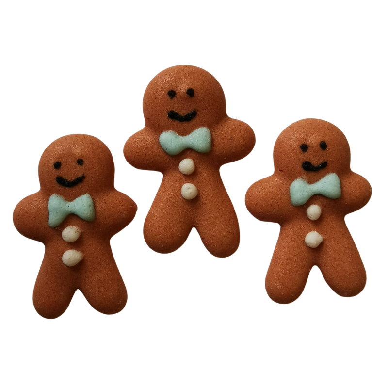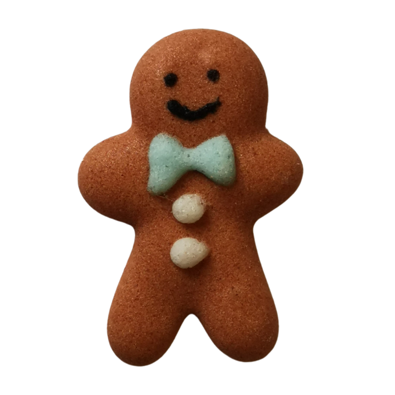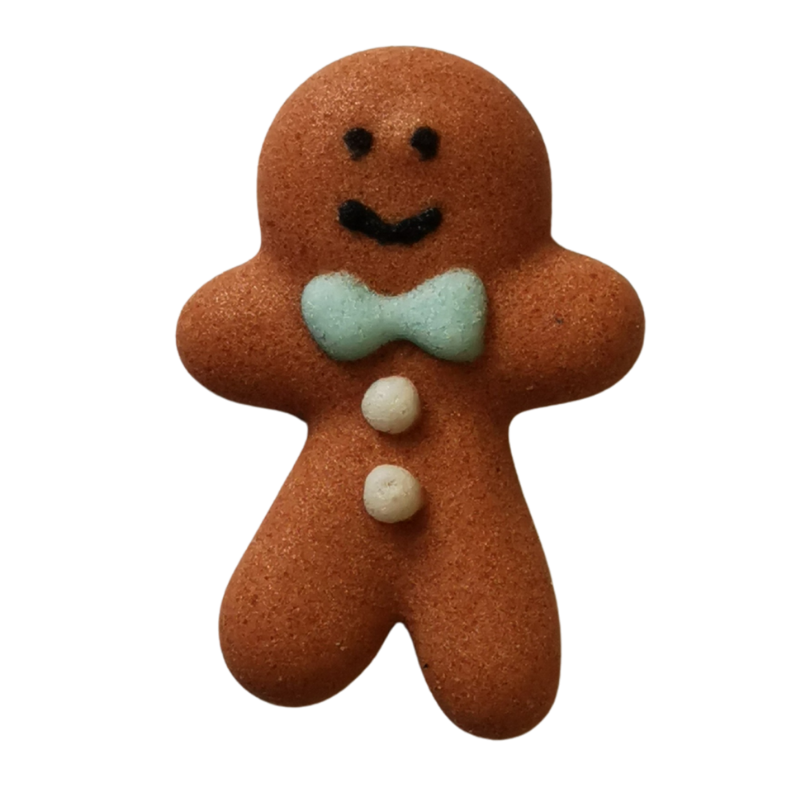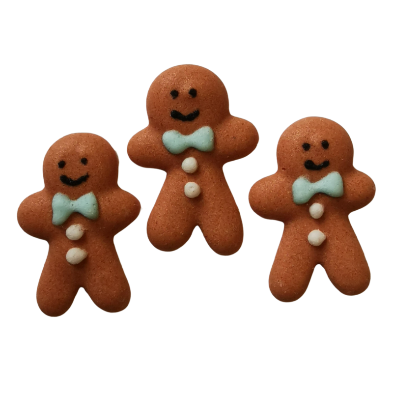 Piernikowy ludzik z niebieską kokardką i guzikami z białego lukru. Gotowy do użycia zestaw dekoracji cukrowych na święta Bożego Narodzenia. Wypukłe dekoracje do ozdabiania świątecznych wypieków i deserów.