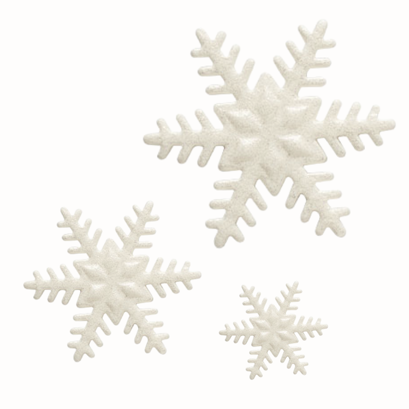 Śnieżynki, zestaw dekoracji cukrowych na święta Bożego Narodzenia w trzech rozmiarach. Płaskie dekoracje w kształcie płatków śniegu do ozdabiania świątecznych wypieków i deserów.