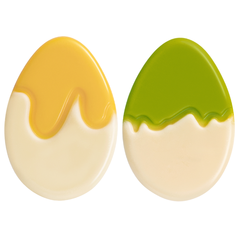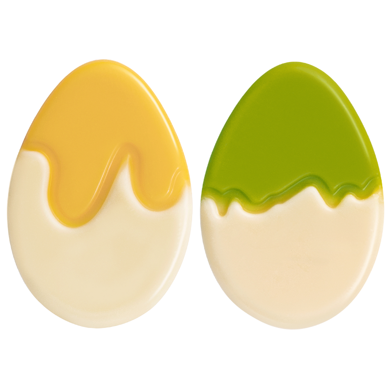 Zestaw wielkanocnych dekoracji - pisanki w kolorze żółtym i zielonym - wykonane z dekorowanej białej czekolady. Idealny sposób na szybką i efektowną dekorację Twoich świątecznych wyrobów. Doskonale sprawdzą się zarówno w profesjonalnej jak i domowej pracowni cukierniczej.