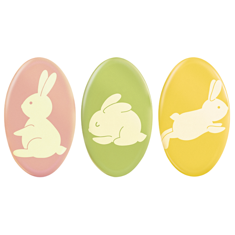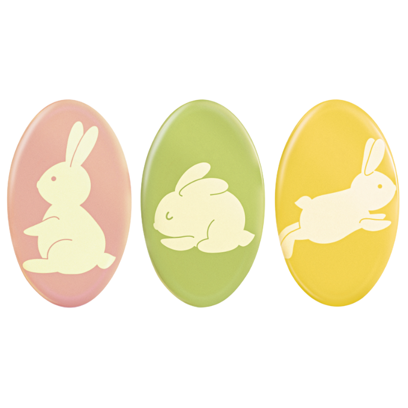 Kolorowe pisanki z wzorem w króliczki - wykonane z barwionej białej czekolady. Idealny sposób na szybką i efektowną dekorację Twoich świątecznych wyrobów. Doskonale sprawdzi się zarówno w profesjonalnej jak i domowej pracowni cukierniczej.