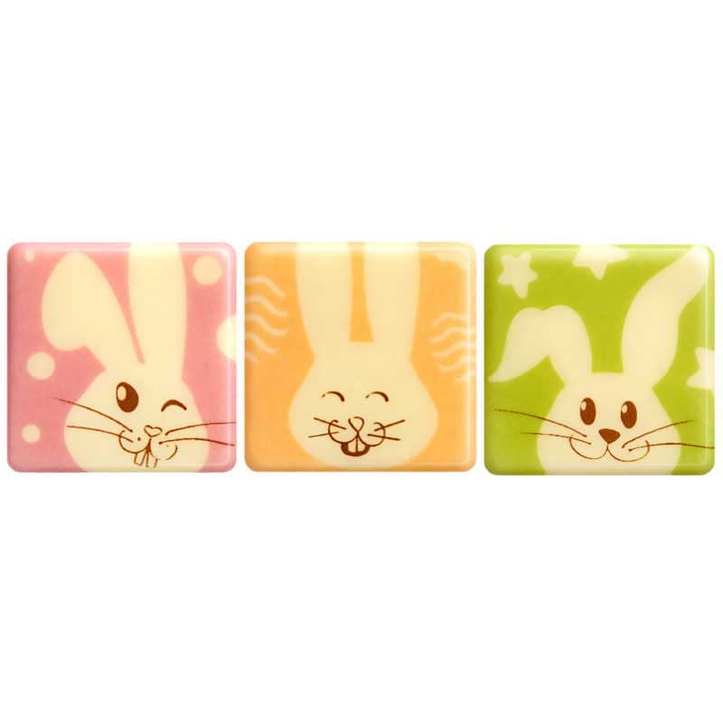 Zestaw kolorowych plakietek z białej czekolady do dekoracji wielkanocnych wyrobów cukierniczych. Wesoły nadruk w trzech wzorach, który doda optymizmu do Twoich słodkich kreacji. Urocza dekoracja do tradycyjnych świątecznych mazurków i lukrowanej baby drożdżowej.