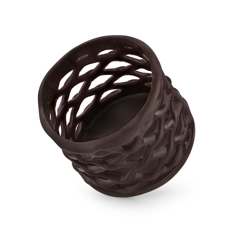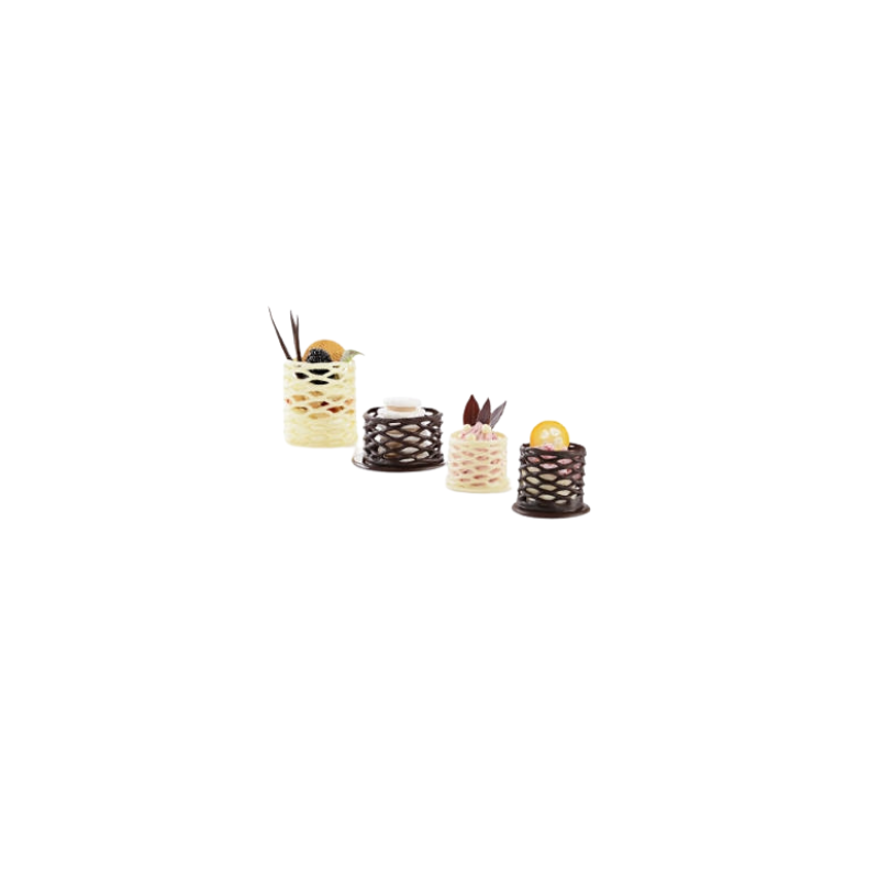 Seria pobudzających kreatywność ażurowych dekoracji wykonanych z ciemnej czekolady. Uniwersalna dekoracja w postaci niewielkich koszyczków, która doskonale sprawdzi się do mini deserów oraz różnego rodzaju wypieków i deserów.