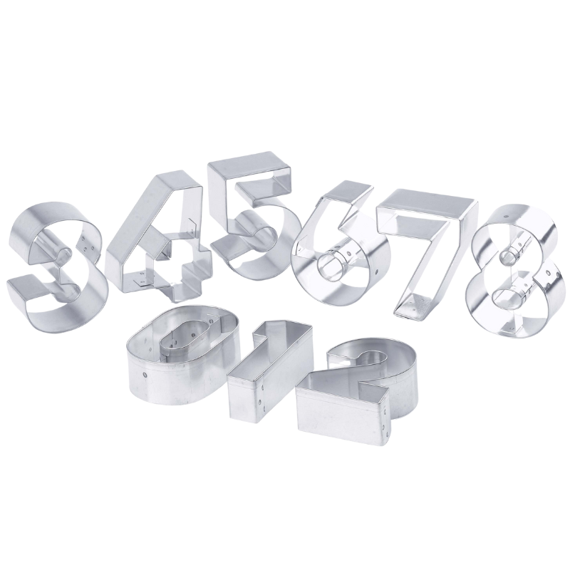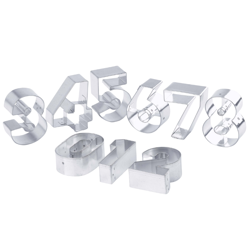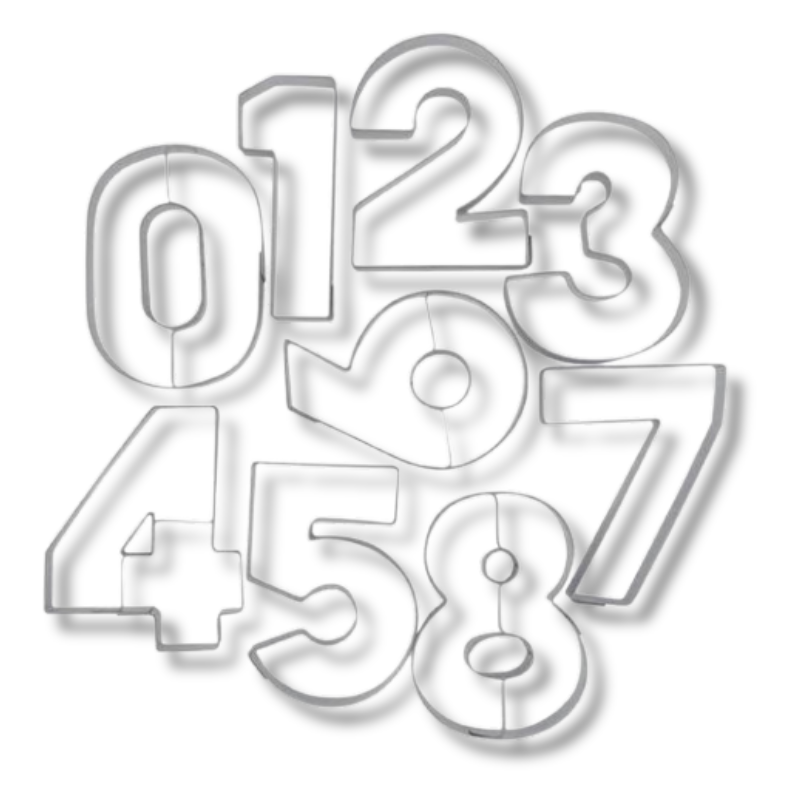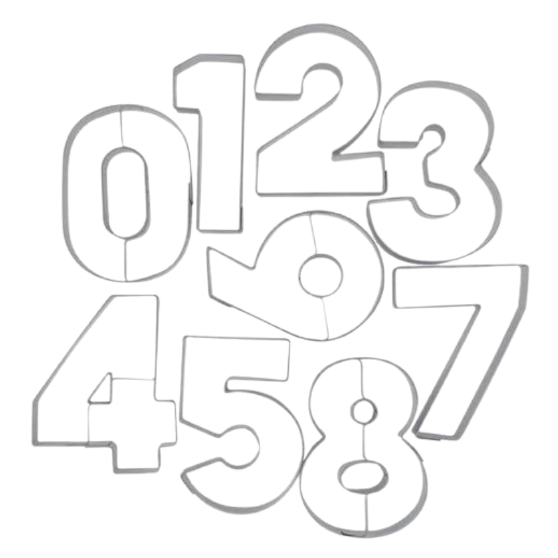 Zestaw foremek do wykrawania - cyfry od 0 do 8 (jedna foremka służy do wykrawania cyfry 6 i 9). Wykonane z metalu przeznaczonego do kontaktu z żywnością Dolna krawędź foremki jest lekko zaostrzona, co pozwala na łatwe wycinanie kształtów. Górna krawędź foremki jest zaokrąglona, co zapewnia bezpieczeństwo podczas użytkowania. Metalowe foremki po zakończonej pracy należy dokładnie umyć (ręcznie) i osuszyć. Foremki mają długość około 65 milimetrów i wysokość około 25 milimetrów.