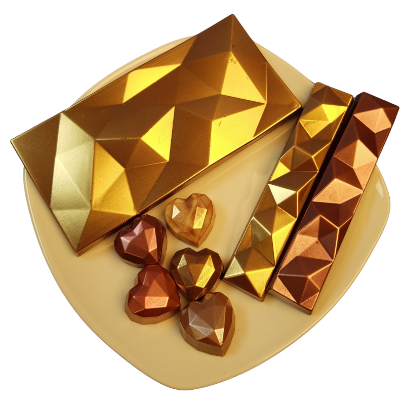 Kolekcja form do tworzenia klasycznych, nowoczesnych, dekorowanych lub nadziewanych batonów czekoladowych. Dopracowane wzory przeznaczone do ręcznego i maszynowego formowania. Wykonane z wytrzymałego i odpornego poliwęglanu o półtransparentnej barwie.