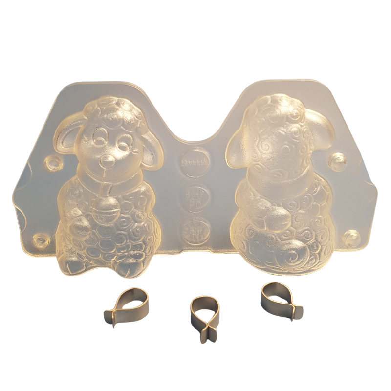 To forma z poliwęglanu do tworzenia figurek czekoladowych w kształcie siedzącego baranka.