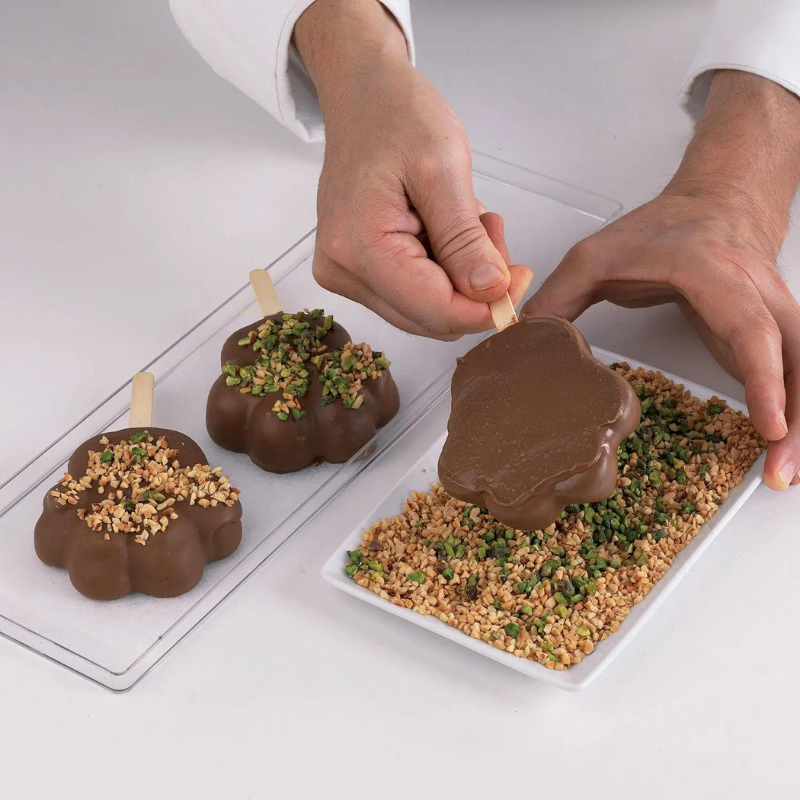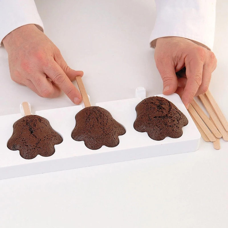 Seria form silikonowych przeznaczonych do tworzenia nowoczesnych lodów, deserów, wypieków i monoporcji na patyku. nowoczesne desery i wypieki na patyku doskonale sprawdzą się na różnego rodzaju przyjęciach i uroczystościach jako element dekoracyjny słodkiego stołu. Zostały wykonane z najwyższej jakości płynnego silikonu platynowego, który charakteryzuje się znaczną elastycznością oraz stabilnością termiczną - zapewniając wygodę oraz wydajność pracy. Formy przeznaczone są do pieczenia, chłodzenia, mrożenia oraz dają możliwość szokowego zamrażania. Wykazują odporność na działanie temperatur w zakresie od (-) 60°C do (+) 230°C, dają możliwość użytkowania w kuchence mikrofalowej oraz bezpiecznego mycia w zmywarce.