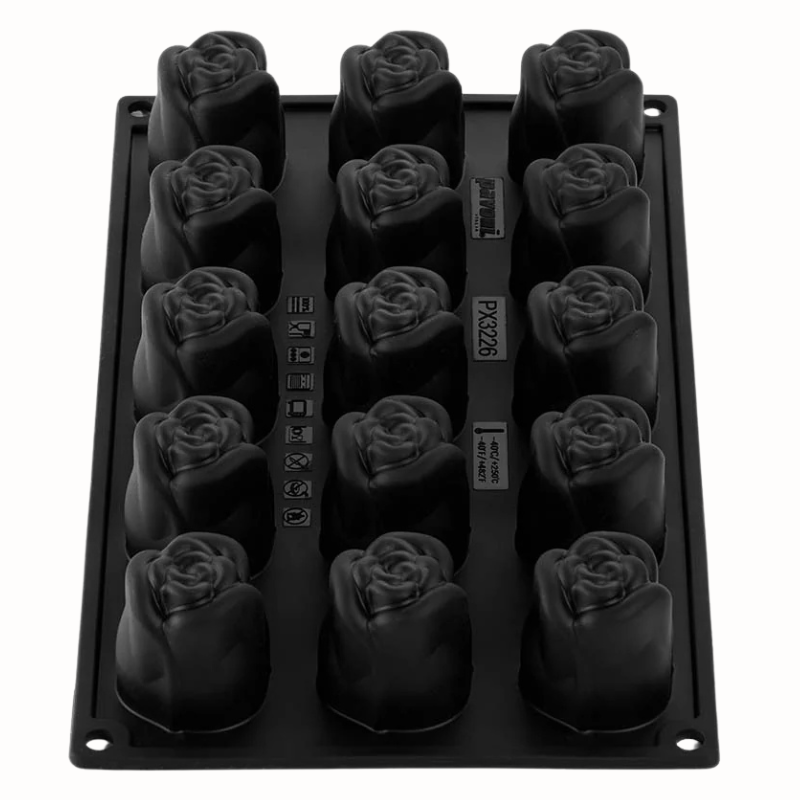Romance40time od Pavoni Italia, forma silikonowa do mini deserów w kształcie kwiatów róży. Profesjonalna forma silikonowa stworzona we współpracy z Antonio Bachour. Forma pozwala na jednorazowe przygotowanie 15 dekoracyjnych porcji o wymiarach: śr. 40 mm x wys. 45 mm i pojemności 40 ml.