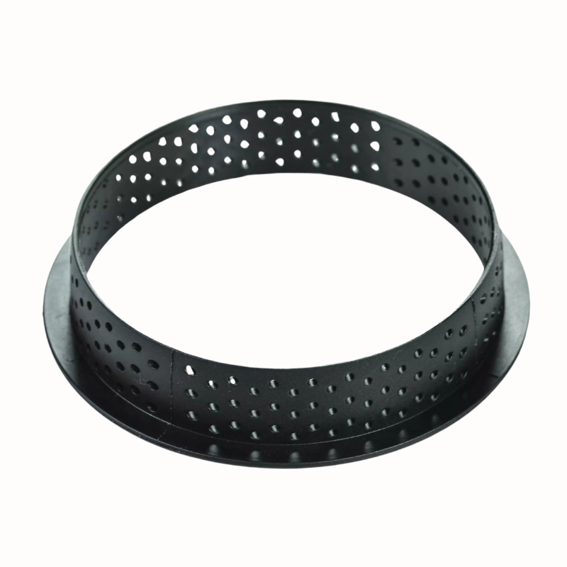 Tarte Ring to seria perforowanych rantów o różnych kształtach, do wypieku ciasta kruchego marki Silikomart Professional. Ranty wykonane są z termoplastycznego kompozytu o wysokiej odporności na zgniatanie. Materiał wykazuje odporność na działanie wysokich temperatur podczas pieczenia oraz niskich podczas chłodzenia, mrożenia i szokowego zamrażania. Maksymalna temperatura pieczenia z zastosowaniem rantów to 180°C, zaś maksymalna temperatura mrożenia to (-) 60°C. Seria przeznaczona jest do tworzenia spodów z kruchego ciasta stanowiących bazę różnego rodzaju deserów i potraw. Perforacja zastosowana w rantach zapewnia doskonałą cyrkulację powietrza, a tym samym równomierne rozprowadzanie ciepła. Kruche ciasto po wypieczeniu charakteryzuje się równomiernym stopniem wypieczenia oraz zarumienienia. Dodatkowo perforacja przyspiesza proces studzenia wypieków, co pozwala na uzyskanie wyjątkowej kruchości i chrupkości. Spody rantów są nieco szersze, co zapewnia im całkowitą stabilność podczas pieczenia i studzenia. Ranty posiadają gładką powierzchnię zapobiegającą przywieraniu wypieków oraz zapewniającą ich łatwe wyjmowanie bez naruszenia kształtu i formy. Ponadto nie ma konieczności zabezpieczania rantów tłuszczem przed pieczeniem. Idealnie sprawdzą się w profesjonalnej jak i domowej kuchni oraz cukierni.