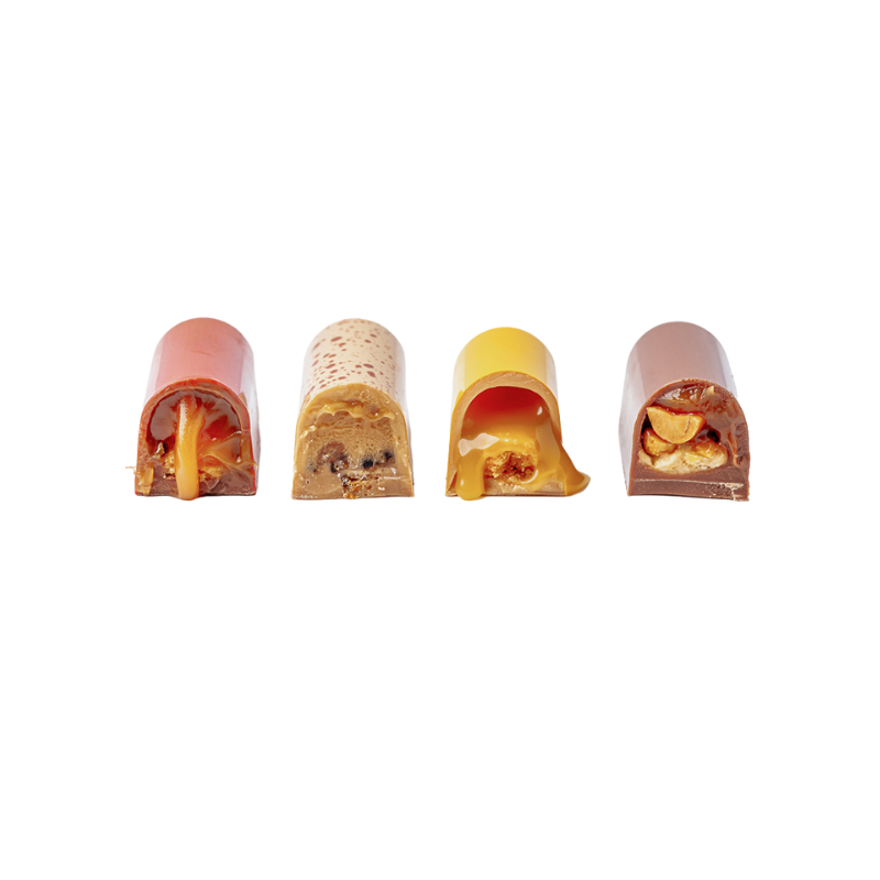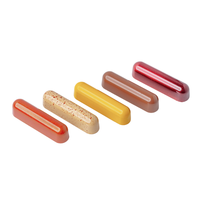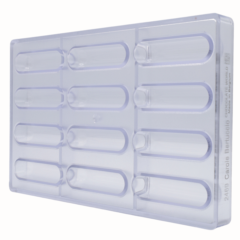 Formy do pracy z czekoladą wykonane z poliwęglanu charakteryzują się wyjątkową trwałością i wytrzymałością. Są odporne na uszkodzenia mechaniczne oraz działanie zarówno wysokich jak i niskich temperatur. Materiał, z którego wykonane są formy zapewnia idealnie błyszczącą powierzchnię wyrobów czekoladowych oraz zmniejsza ryzyko wystąpienia matowych plam. Zapewnia również równomierne rozprowadzanie ciepła, co ma ogromne znaczenie podczas pracy z czekoladą. Dodatkową zaletą form wykonanych z poliwęglanu jest ich transparentna barwa, która pozwala na kontrolę podczas formowania kształtów. Ponadto materiał pod wpływem zmian temperatury kurczy się wolniej niż czekolada, co znacznie ułatwia proces wyjmowania kształtów z formy. Przed wlaniem czekolady, formę należy lekko podgrzać, co zapobiega zbyt dużej różnicy temperatur i tym samym zmętnieniu czekolady. Formy należy napełniać jedynie odpowiednio zatemperowaną czekoladą.