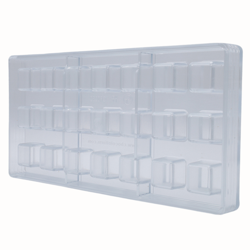 Formy do pracy z czekoladą wykonane z poliwęglanu charakteryzują się wyjątkową trwałością i wytrzymałością. Są odporne na uszkodzenia mechaniczne oraz działanie zarówno wysokich jak i niskich temperatur. Materiał, z którego wykonane są formy zapewnia idealnie błyszczącą powierzchnię wyrobów czekoladowych oraz zmniejsza ryzyko wystąpienia matowych plam. Zapewnia również równomierne rozprowadzanie ciepła, co ma ogromne znaczenie podczas pracy z czekoladą. Dodatkową zaletą form wykonanych z poliwęglanu jest ich transparentna barwa, która pozwala na kontrolę podczas formowania kształtów. Ponadto materiał pod wpływem zmian temperatury kurczy się wolniej niż czekolada, co znacznie ułatwia proces wyjmowania kształtów z formy. Przed wlaniem czekolady, formę należy lekko podgrzać, co zapobiega zbyt dużej różnicy temperatur i tym samym zmętnieniu czekolady. Formy należy napełniać jedynie odpowiednio zatemperowaną czekoladą.