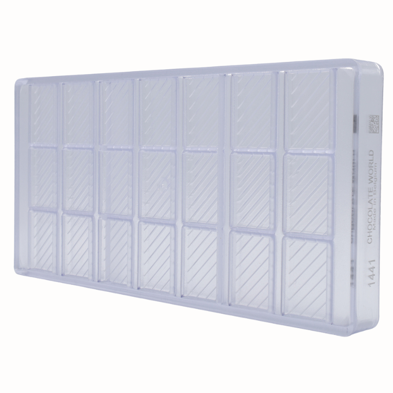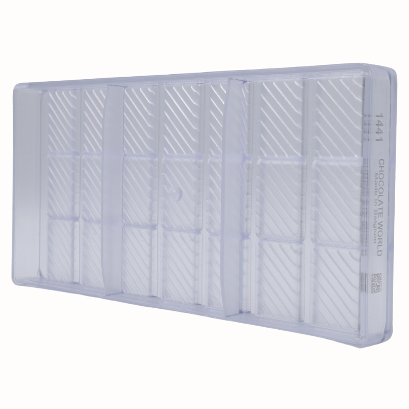 Formy do pracy z czekoladą wykonane z poliwęglanu charakteryzują się wyjątkową trwałością i wytrzymałością. Są odporne na uszkodzenia mechaniczne oraz działanie zarówno wysokich jak i niskich temperatur. Materiał, z którego wykonane są formy zapewnia idealnie błyszczącą powierzchnię wyrobów czekoladowych oraz zmniejsza ryzyko wystąpienia matowych plam. Zapewnia również równomierne rozprowadzanie ciepła, co ma ogromne znaczenie podczas pracy z czekoladą. Dodatkową zaletą form wykonanych z poliwęglanu jest ich transparentna barwa, która pozwala na kontrolę podczas formowania kształtów. Ponadto materiał pod wpływem zmian temperatury kurczy się wolniej niż czekolada, co znacznie ułatwia proces wyjmowania kształtów z formy. Przed wlaniem czekolady, formę należy lekko podgrzać, co zapobiega zbyt dużej różnicy temperatur i tym samym zmętnieniu czekolady. Formy należy napełniać jedynie odpowiednio zatemperowaną czekoladą.