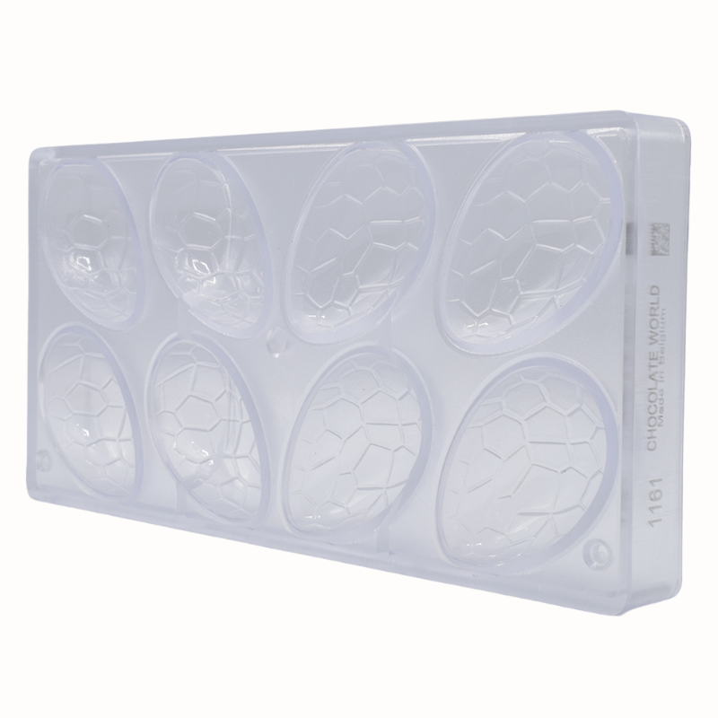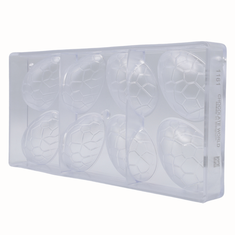 Formy do pracy z czekoladą wykonane z poliwęglanu charakteryzują się wyjątkową trwałością i wytrzymałością. Są odporne na uszkodzenia mechaniczne oraz działanie zarówno wysokich jak i niskich temperatur. Materiał, z którego wykonane są formy zapewnia idealnie błyszczącą powierzchnię wyrobów czekoladowych oraz zmniejsza ryzyko wystąpienia matowych plam. Zapewnia również równomierne rozprowadzanie ciepła, co ma ogromne znaczenie podczas pracy z czekoladą. Dodatkową zaletą form wykonanych z poliwęglanu jest ich transparentna barwa (niekiedy półtransparentna - lekko żółta), która pozwala na kontrolę podczas formowania kształtów. Ponadto materiał pod wpływem zmian temperatury kurczy się wolniej niż czekolada, co znacznie ułatwia proces wyjmowania kształtów z formy. Przed wlaniem czekolady, formę należy lekko podgrzać, co zapobiega zbyt dużej różnicy temperatur i tym samym zmętnieniu czekolady. Formy należy napełniać jedynie odpowiednio zatemperowaną czekoladą.