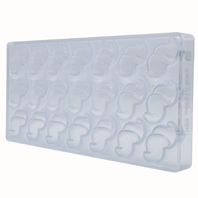 Formy do pracy z czekoladą wykonane z poliwęglanu charakteryzują się wyjątkową trwałością i wytrzymałością. Są odporne na uszkodzenia mechaniczne oraz działanie zarówno wysokich jak i niskich temperatur. Materiał, z którego wykonane są formy zapewnia idealnie błyszczącą powierzchnię wyrobów czekoladowych oraz zmniejsza ryzyko wystąpienia matowych plam. Zapewnia również równomierne rozprowadzanie ciepła, co ma ogromne znaczenie podczas pracy z czekoladą. Dodatkową zaletą form wykonanych z poliwęglanu jest ich transparentna barwa, która pozwala na kontrolę podczas formowania kształtów. Ponadto materiał pod wpływem zmian temperatury kurczy się wolniej niż czekolada, co znacznie ułatwia proces wyjmowania kształtów z formy. Przed wlaniem czekolady, formę należy lekko podgrzać, co zapobiega zbyt dużej różnicy temperatur i tym samym zmętnieniu czekolady. Formy należy napełniać jedynie odpowiednio zatemperowaną czekoladą.