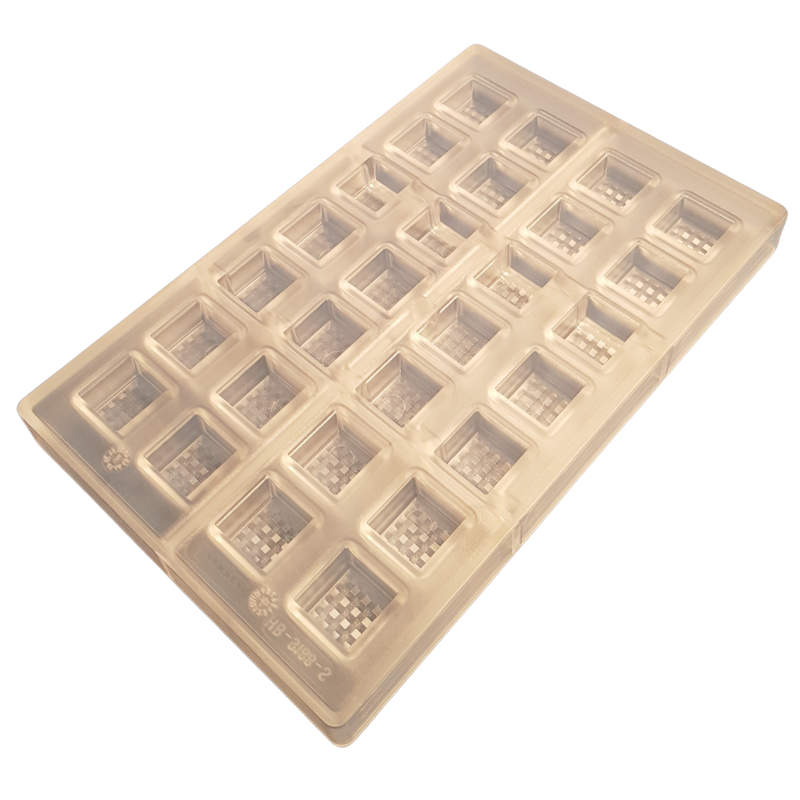 To forma z poliwęglanu do tworzenia nadziewanych i dekorowanych pralin o dekoracyjnym kwadratowym kształcie.
