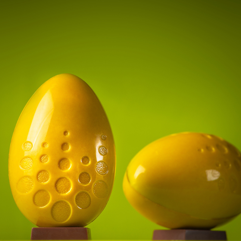 To forma z poliwęglanu do tworzenia nadziewanych i dekorowanych pralin w kształcie pisanek z wzorem okręgów.
