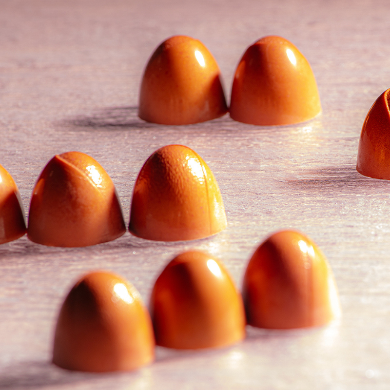 To forma z poliwęglanu do tworzenia nadziewanych i dekorowanych pralin w kształcie zaokrąglonego stożka w strukturalny wzór.