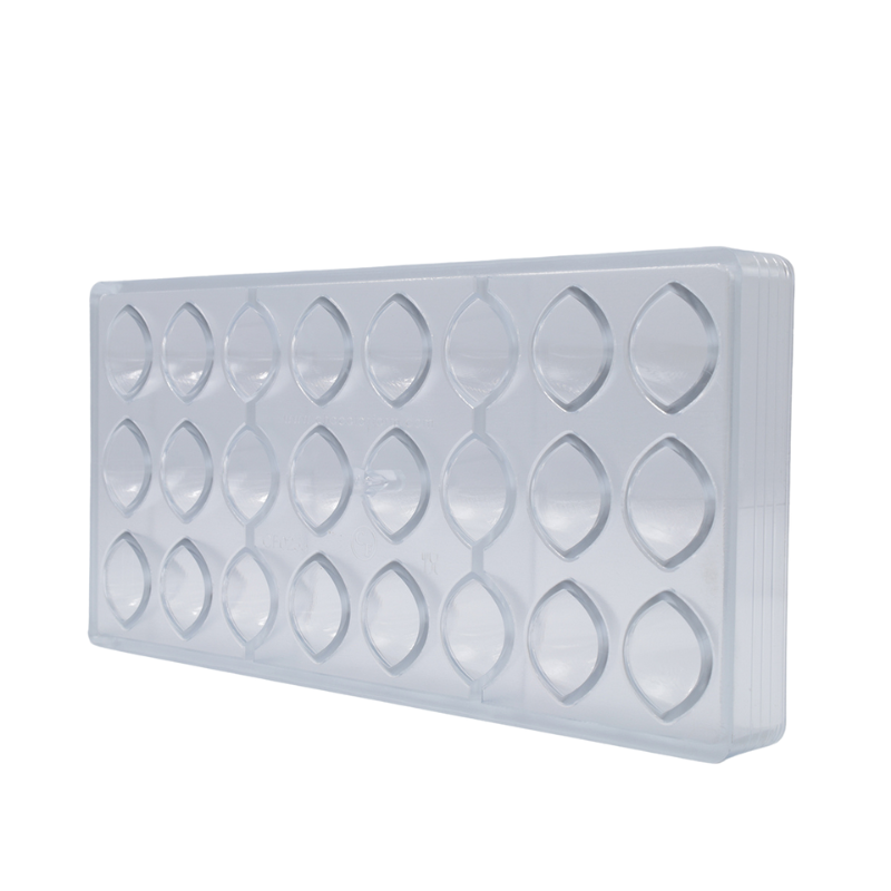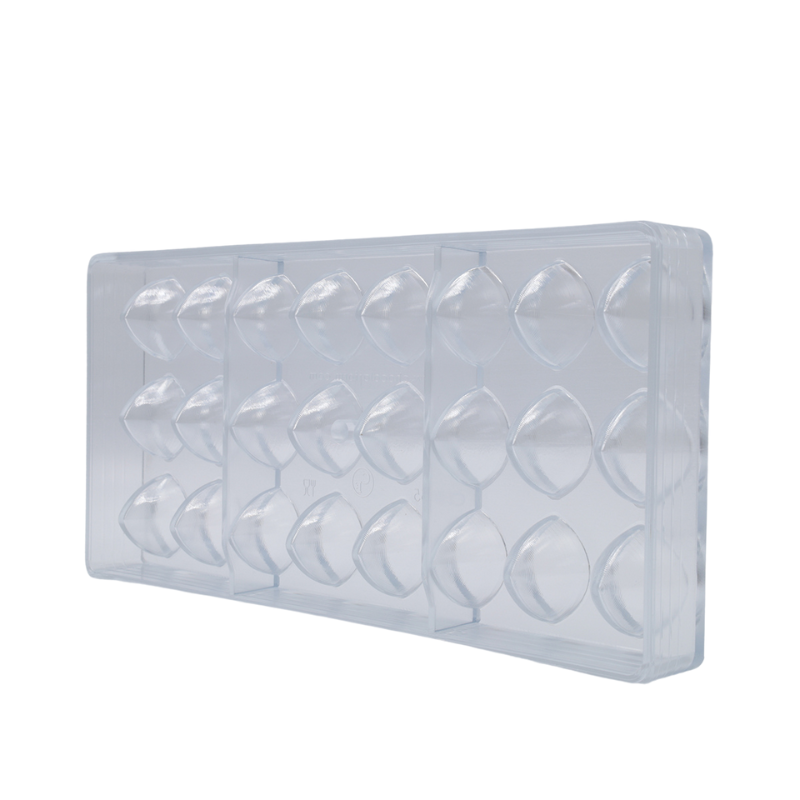Formy do pracy z czekoladą wykonane z poliwęglanu charakteryzują się wyjątkową trwałością i wytrzymałością. Są odporne na uszkodzenia mechaniczne oraz działanie zarówno wysokich jak i niskich temperatur. Materiał, z którego wykonane są formy zapewnia idealnie błyszczącą powierzchnię wyrobów czekoladowych oraz zmniejsza ryzyko wystąpienia matowych plam. Zapewnia również równomierne rozprowadzanie ciepła, co ma ogromne znaczenie podczas pracy z czekoladą. Dodatkową zaletą form wykonanych z poliwęglanu jest ich transparentna barwa (niekiedy półtransparentna - lekko żółta), która pozwala na kontrolę podczas formowania kształtów. Ponadto materiał pod wpływem zmian temperatury kurczy się wolniej niż czekolada, co znacznie ułatwia proces wyjmowania kształtów z formy. Przed wlaniem czekolady, formę należy lekko podgrzać, co zapobiega zbyt dużej różnicy temperatur i tym samym zmętnieniu czekolady. Formy należy napełniać jedynie odpowiednio zatemperowaną czekoladą.