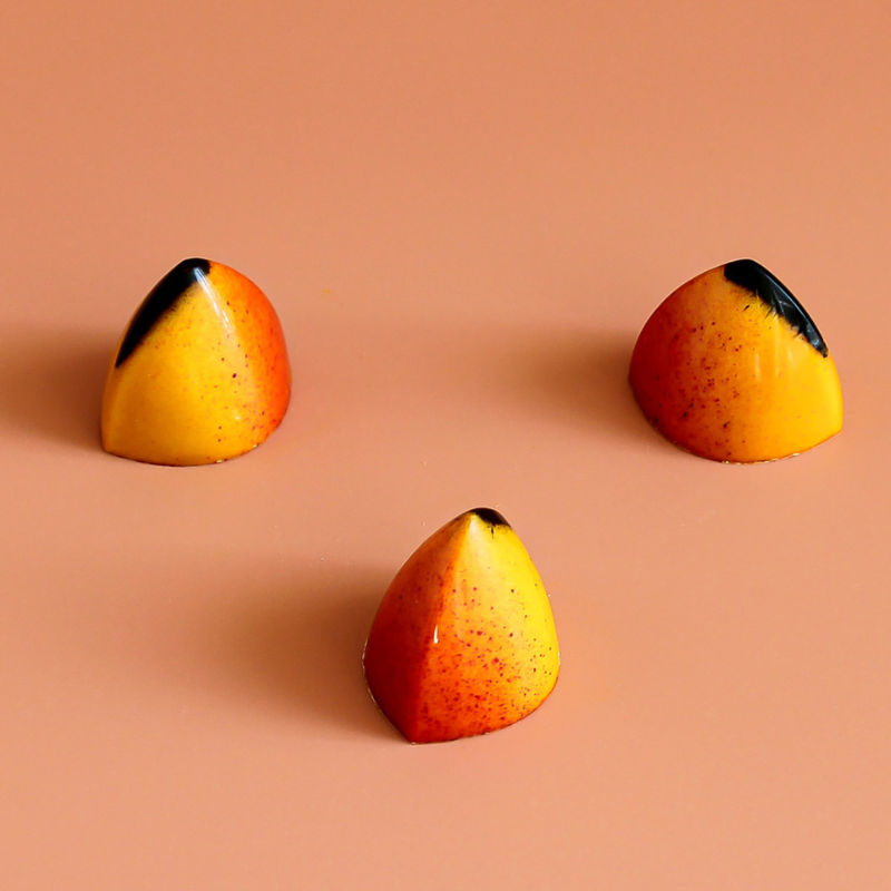 To forma z poliwęglanu do tworzenia nadziewanych i dekorowanych pralin w kształcie nowoczesnego trójkąta.