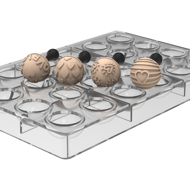 Zestaw do dekorowania pralin czekoladowych składa się z formy do pralin wykonanej z Tritanu oraz czterech silikonowych stempli z ergonomicznym uchwytem. Forma pozwala na tworzenie pralin w klasycznym kształcie półkuli. Wygodne stemple pozwalają na precyzyjne odciskanie dekoracyjnych wzorów.