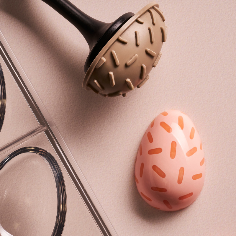Innowacyjny zestaw do tworzenia dekoracyjnych pralin czekoladowych w kształcie pisanek. W zestawie znajduje się forma wykonana z Tritanu oraz silikonowe stemple do odciskania dekoracyjnych worów na Wielkanoc.