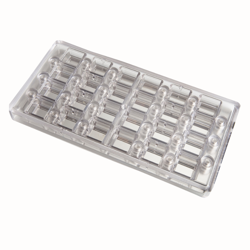 Formy do pracy z czekoladą wykonane z poliwęglanu charakteryzują się wyjątkową trwałością i wytrzymałością. Są odporne na uszkodzenia mechaniczne oraz działanie zarówno wysokich jak i niskich temperatur. Materiał, z którego wykonane są formy zapewnia idealnie błyszczącą powierzchnię wyrobów czekoladowych oraz zmniejsza ryzyko wystąpienia matowych plam. Zapewnia również równomierne rozprowadzanie ciepła, co ma ogromne znaczenie podczas pracy z czekoladą. Dodatkową zaletą form wykonanych z poliwęglanu jest ich transparentna barwa, która pozwala na kontrolę podczas formowania kształtów. Ponadto materiał pod wpływem zmian temperatury kurczy się wolniej niż czekolada, co znacznie ułatwia proces wyjmowania kształtów z formy. Przed wlaniem czekolady, formę należy lekko podgrzać, co zapobiega zbyt dużej różnicy temperatur i tym samym zmętnieniu czekolady. Formy należy napełniać jedynie odpowiednio zatemperowaną czekoladą.