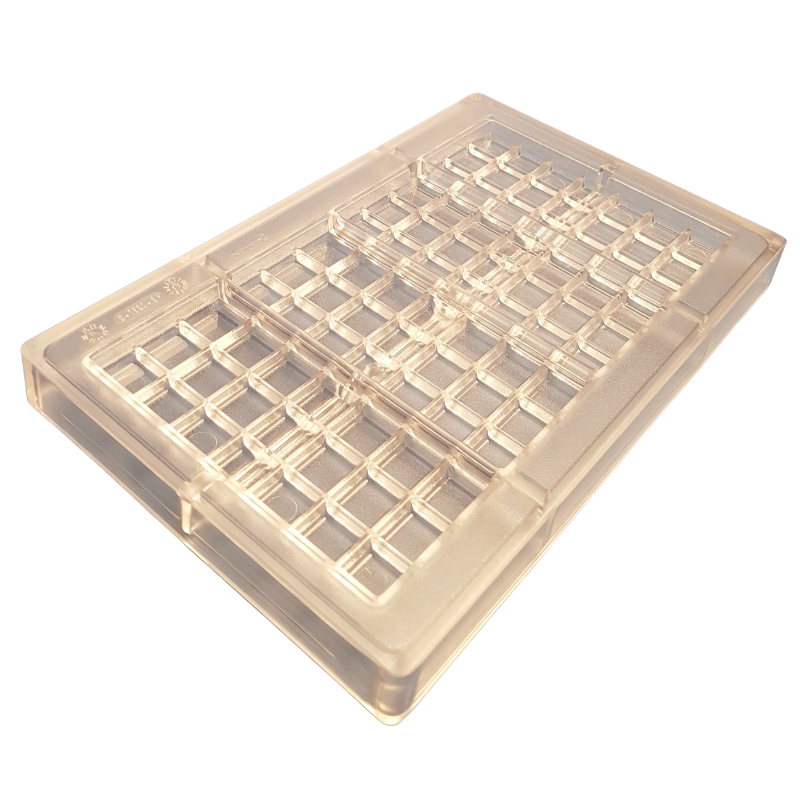 To forma z poliwęglanu do tworzenia tabliczek czekolady o prostokątnym kształcie z kwadratowymi kawałkami.