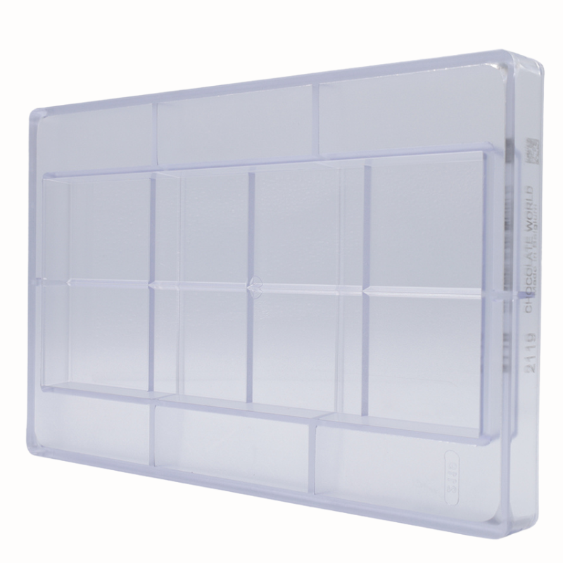 Formy do pracy z czekoladą wykonane z poliwęglanu charakteryzują się wyjątkową trwałością i wytrzymałością. Są odporne na uszkodzenia mechaniczne oraz działanie zarówno wysokich jak i niskich temperatur. Materiał, z którego wykonane są formy zapewnia idealnie błyszczącą powierzchnię wyrobów czekoladowych oraz zmniejsza ryzyko wystąpienia matowych plam. Zapewnia również równomierne rozprowadzanie ciepła, co ma ogromne znaczenie podczas pracy z czekoladą. Dodatkową zaletą form wykonanych z poliwęglanu jest ich transparentna barwa, która pozwala na kontrolę podczas formowania kształtów. Ponadto materiał pod wpływem zmian temperatury kurczy się wolniej niż czekolada, co znacznie ułatwia proces wyjmowania kształtów z formy. Przed wlaniem czekolady, formę należy lekko podgrzać, co zapobiega zbyt dużej różnicy temperatur i tym samym zmętnieniu czekolady. Formy należy napełniać jedynie odpowiednio zatemperowaną czekoladą.
