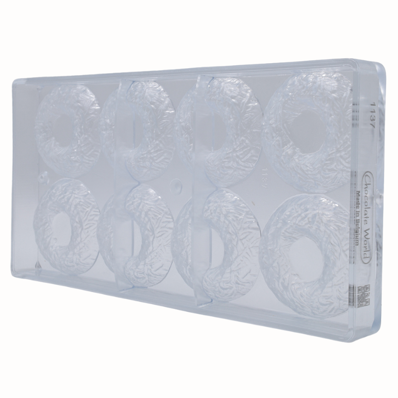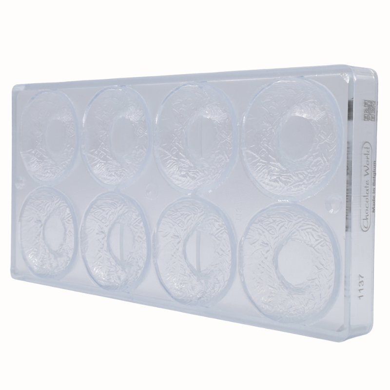 Formy do pracy z czekoladą wykonane z poliwęglanu charakteryzują się wyjątkową trwałością i wytrzymałością. Są odporne na uszkodzenia mechaniczne oraz działanie zarówno wysokich jak i niskich temperatur. Materiał, z którego wykonane są formy zapewnia idealnie błyszczącą powierzchnię wyrobów czekoladowych oraz zmniejsza ryzyko wystąpienia matowych plam. Zapewnia również równomierne rozprowadzanie ciepła, co ma ogromne znaczenie podczas pracy z czekoladą. Dodatkową zaletą form wykonanych z poliwęglanu jest ich transparentna barwa, która pozwala na kontrolę podczas formowania kształtów. Ponadto materiał pod wpływem zmian temperatury kurczy się wolniej niż czekolada, co znacznie ułatwia proces wyjmowania kształtów z formy. Przed wlaniem czekolady, formę należy lekko podgrzać, co zapobiega zbyt dużej różnicy temperatur i tym samym zmętnieniu czekolady. Formy należy napełniać jedynie odpowiednio zatemperowaną czekoladą.